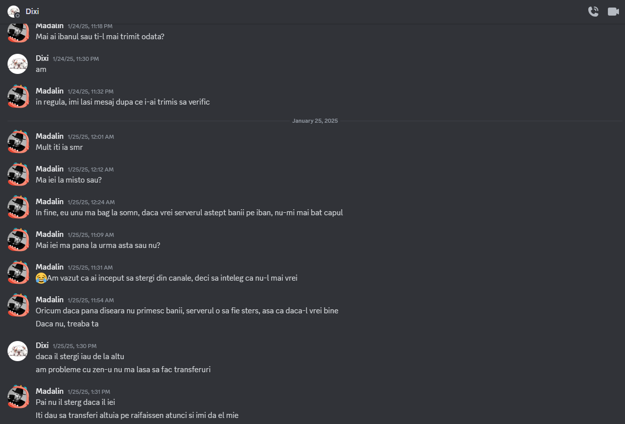 *Detalii despre incident: Pe langa faptul ca a venit cu "tupeu" sa imi ceara un server de discord in 16 limbi, nici macar nu stia ce vrea, in sensul ca mi-a spus sa ma "inspir" dupa alte 2 servere care erau total diferite unul fata de celalalt. M-a grabit cu crearea serverului eu fiind plecat, iar cand a fost vorba de plata doar incerca sa gaseasca motive sa nu plateasca (ba ca nu merge sa plateasca, ba ca mi i-a trimis, etc..)